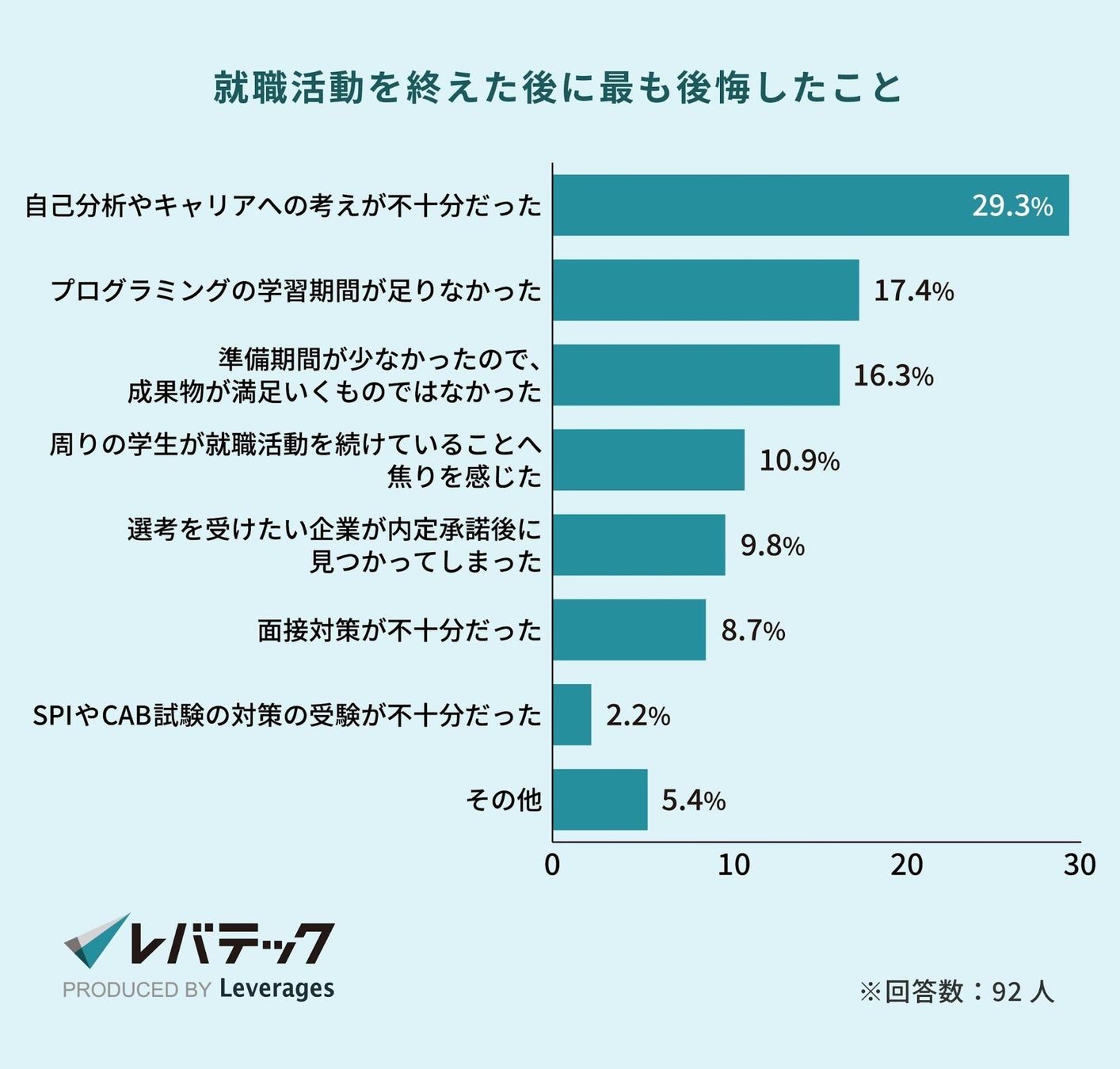 就職活動を終了後に後悔したことの1位には、「自己分析やキャリアへの考えが不十分だった(29.3%)」があげられました。「プログラミングの学習期間が足りなかった(17.4%)」「準備期間が少なかったので、成果物が満足いくものではなかった(16.3%)」と、自身の技術やアウトプットに関して後悔している人は、合わせて33.7%いることが分かります。
