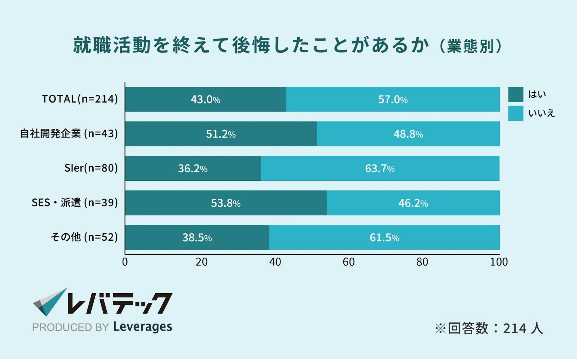 「就職活動を終えた後、自身の就活に関して後悔したことがあるか」という問いに対し、「ある」と回答した人は全体の43.0%でした。