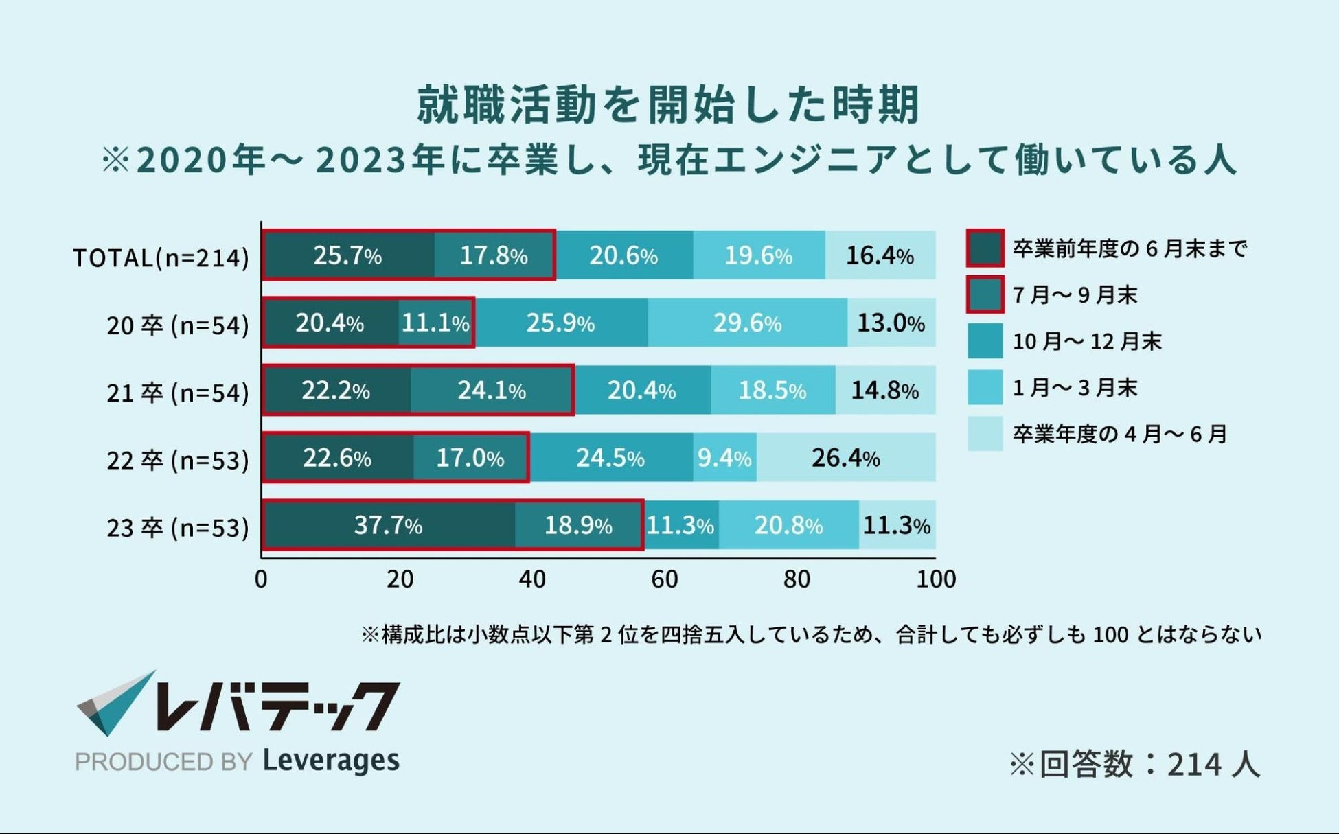 レバテック株式会社が運営する、ITエンジニア専門新卒向け就職支援エージェント、レバテックルーキー(https://rookie.levtech.jp/ )は、2020年から2023年に新卒でエンジニアとして入社した214人を対象に、就職活動に関する実態調査を実施しました。