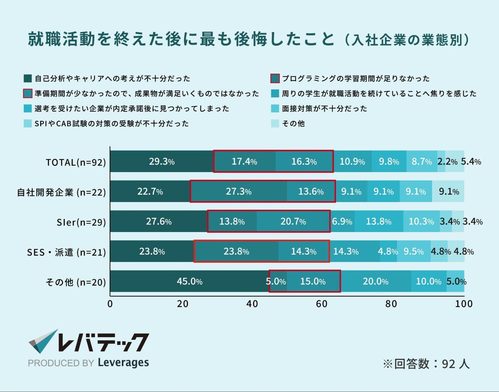 入社した企業の業態別*4で比較した結果、選考においてコーディング試験や成果物提出を求めない傾向にあるSIer、SESに入社を決めた方についても、3割以上が自身のプログラミングの学習期間や成果物の準備期間に関して後悔していることがわかりました。選考において、コーディング試験や成果物の提出を求める企業からの内定獲得が叶わず、準備不足を後悔している方も一定数いると考えられます。