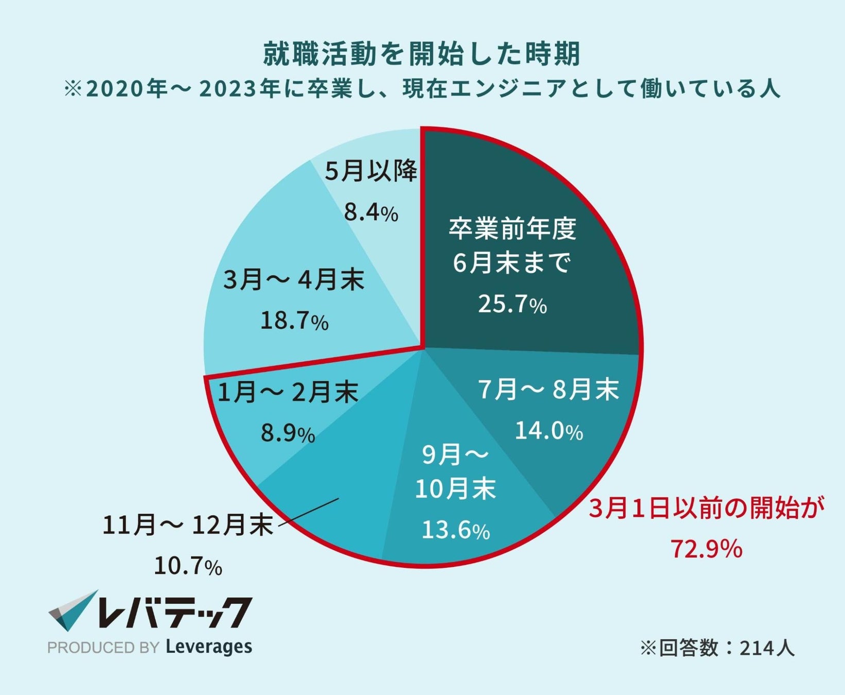 2020年から2023年に卒業したエンジニアのうち、3月までに就職活動を開始*1していた方は72.9%でした。全体の約7割が、内閣府が定める就活解禁日*2の3月1日より前に就職活動を開始していることがわかります。