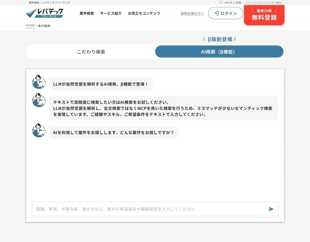 レバテックフリーランス、会話形式で希望案件を探せる「AIチャット案件検索(β版)」を提供開始
