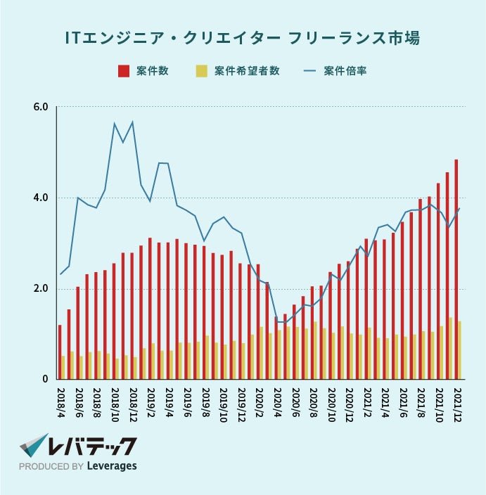 レバテック株式会社が運営する、ITエンジニア・クリエイター専門転職エージェント『レバテックキャリア』( https://career.levtech.jp/ )、フリーランスITエンジニアのための案件紹介サービス『レバテックフリーランス』( https://freelance.levtech.jp/ )は、「正社員転職・フリーランス市場動向 2021年12月」を発表。レバテックエージェントサービスの直近のデータを用いて、ITエンジニア・クリエイターの正社員転職/フリーランス市場における需給の変化を公開します。