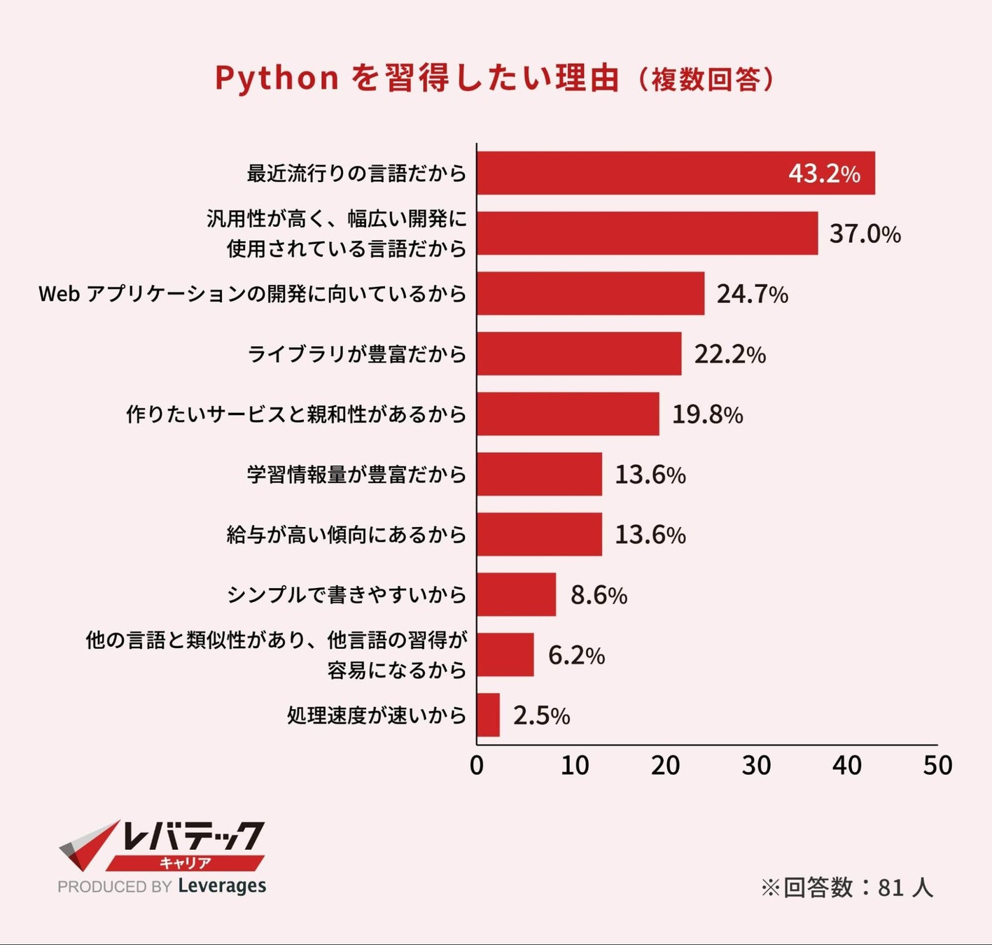 今後、Pythonを習得したい理由としては「最近流行りの言語だから(43.2%)」が最も多く、ついで「汎用性が高く、幅広い開発に使用されている言語だから(37.0%)」「Webアプリケーションの開発に向いているから(24.7%)」でした。 ※複数回答