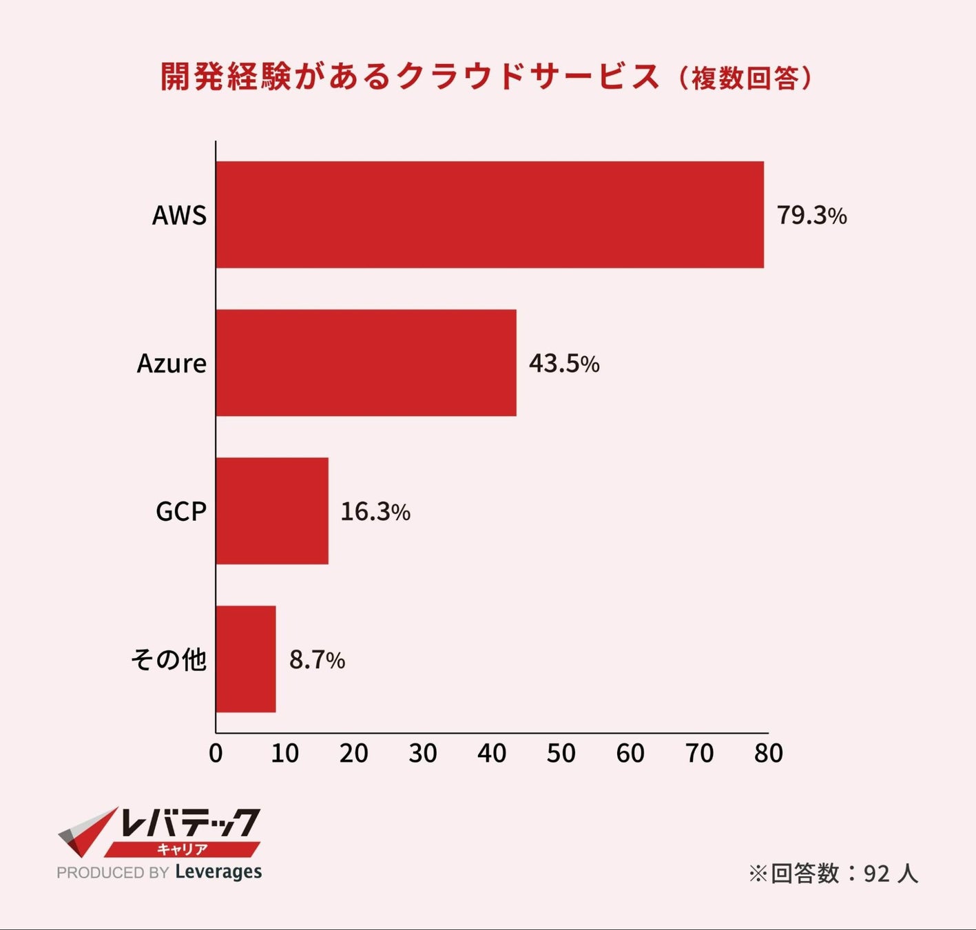そのうち、利用されているクラウドの種類については「AWS(79.3%)」が最多となり、「Azure(43.5%)」「GCP(16.3%)」と続きます。
