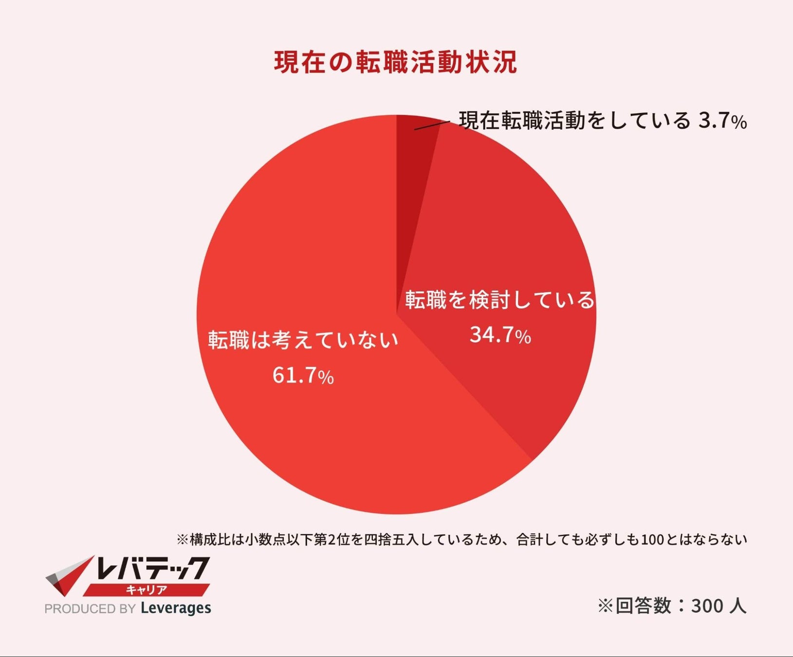 女性エンジニアのうち、現在転職活動をしている人は全体の3.7%という結果になりました。転職を検討している人は全体の34.7%となり、約4割の女性エンジニアが転職活動中または転職を検討していることが分かります。