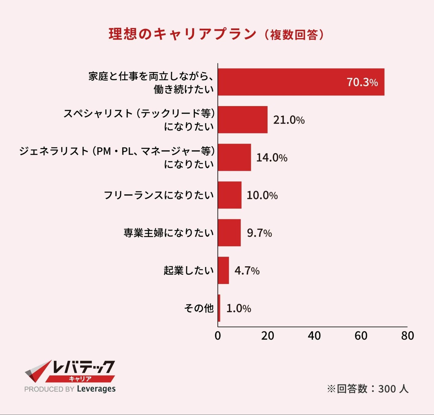 女性エンジニアが選ぶ理想のキャリアプランで最も多かったのは、「家庭と仕事を両立しながら、働き続けたい(70.3%)」となりました。一方、「専業主婦になりたい」と回答した人は全体の9.7%にとどまり、結婚や出産を経験した後も仕事を続けたいと考えている女性エンジニアが多いことが読み取れます。※複数回答