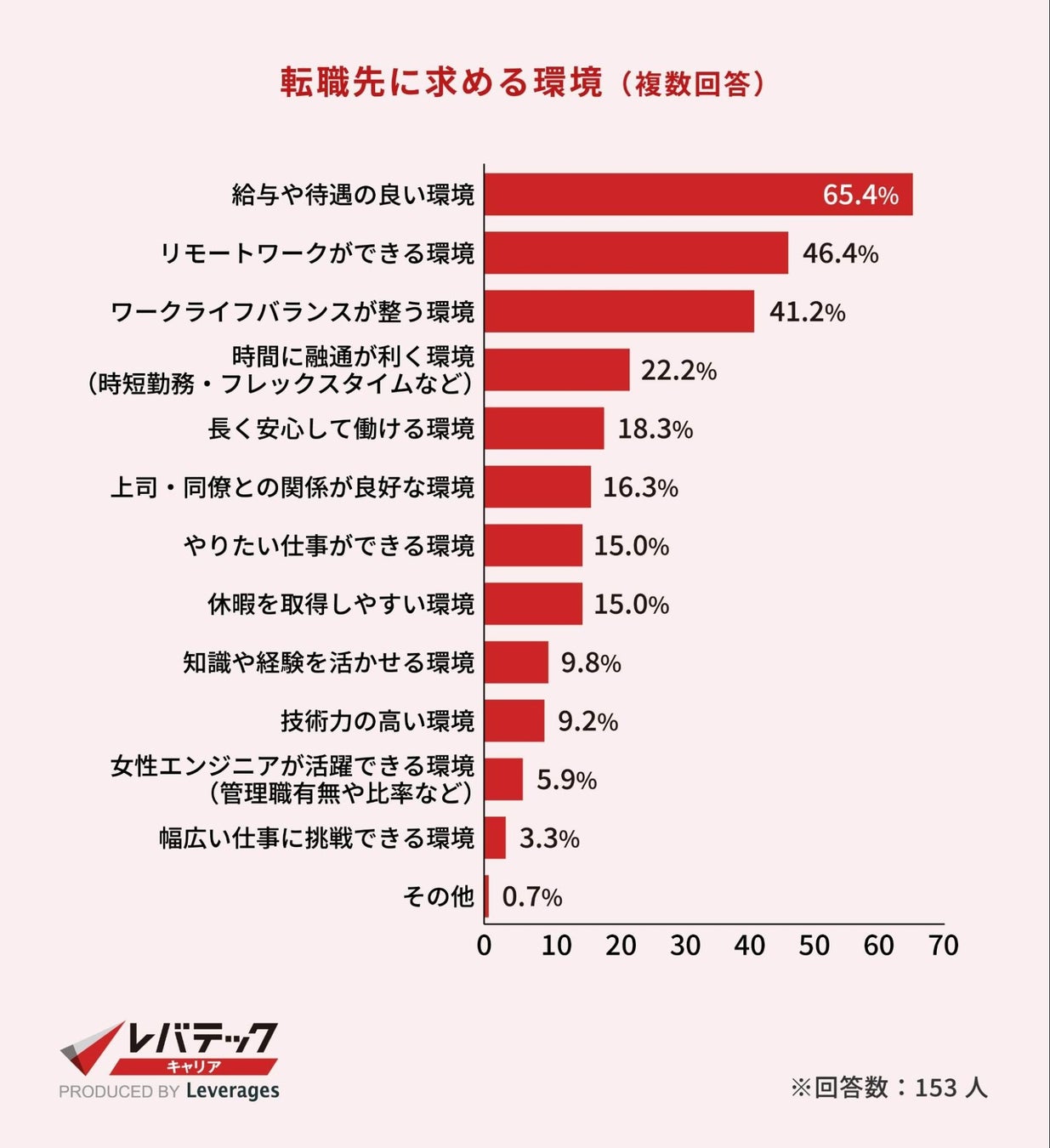 転職先に求める環境においても「給与や待遇の良い環境(65.4%)」が最も多く、ついで「リモートワークができる環境(46.4%)」「ワークライフバランスが整う環境(41.2%)」となりました。技術力の高さや挑戦できる環境よりも、待遇面の向上や長期就業可能な環境を重視する人が多いことが分かります。※複数回答