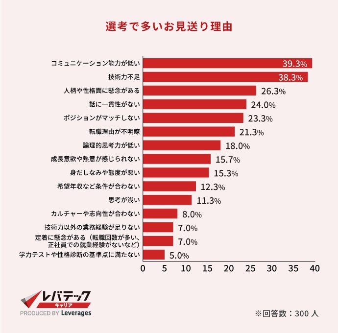 一方、選考のお見送り理由で最も多いのは、「コミュニケーション能力が低い(39.3%)」でした。ついで、ほぼ同率で「技術力不足(38.3%)」の回答が多く、「人柄や性格面に懸念がある(26.3%)」「話に一貫性がない(24.0%)」と続きます。たとえ技術力が高くても、コミュニケーション能力や論理的思考力など、ヒューマンスキルが懸念で採用を見送るケースが多いことが明らかとなりました。