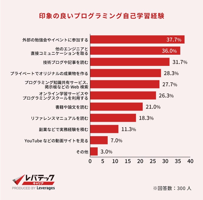 一方で、印象が良いプログラミングの自己学習経験として回答が少なかったのは、「YouTubeなどの動画サイトを見る(7.0%)」でした。ついで、「副業などで実務経験を積む(11.3%)」「リファレンスマニュアルを読む(18.3%)」となりました。