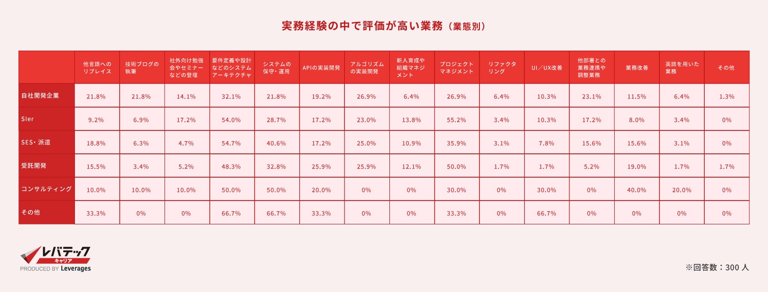 この結果から、どの企業でもプロジェクトマネジメント経験や要件定義・設計などの上流工程の経験が、比較的高く評価をしていることが読み取れます。