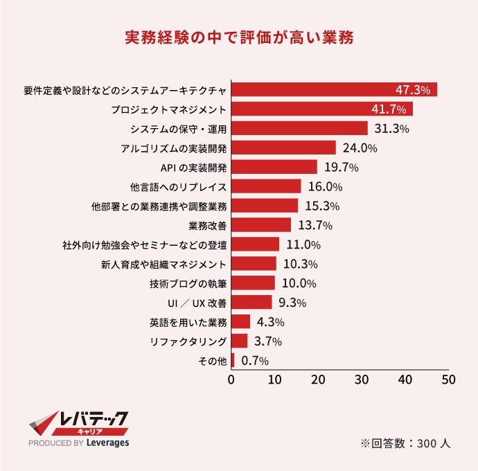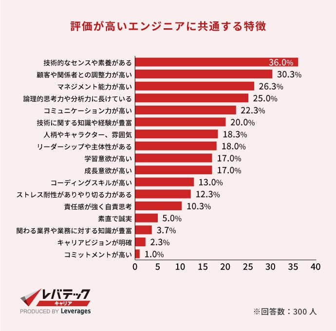 レバテック株式会社が運営するITエンジニア・クリエイター専門エージェント、レバテックキャリア( https://career.levtech.jp/ )は、中途採用担当者300名を対象に、ITエンジニアの選考着眼点について調査を実施しました。
