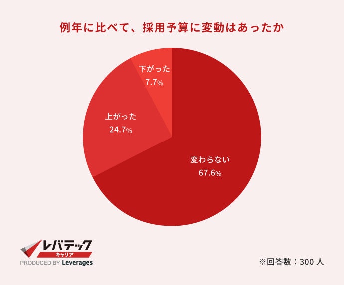 例年に比べて、ITエンジニアの採用予算に変動があった企業は全体の32.4%でした。そのうち、採用予算が上がった企業は全体の24.7%となり、下がった企業は全体の7.7%です。4社に1社がエンジニア採用への投資額を増やしており、多くの企業でエンジニア採用に対する意欲が高まっていることが読み取れます。