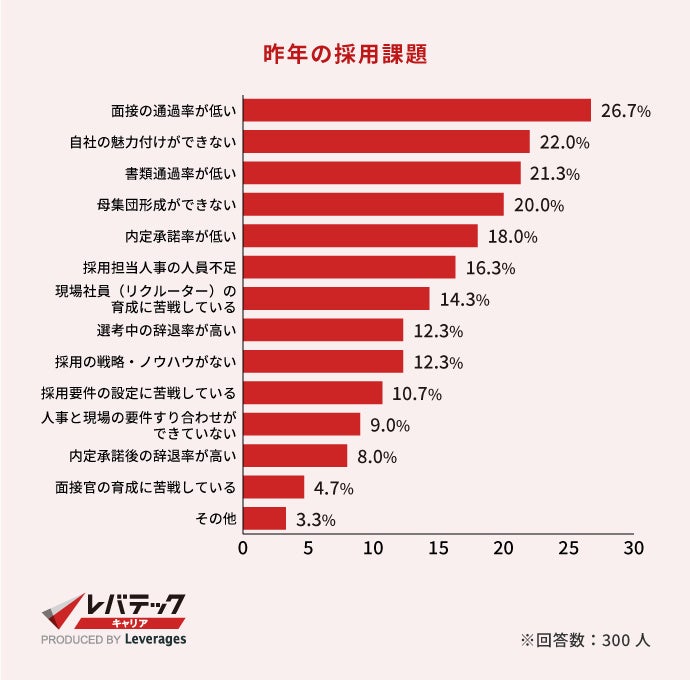 採用担当者が抱えている採用課題として最も多かったのは、「面接の通過率が低い(26.7%)」でした。4社に1社以上が、自社の採用要件に見合う求職者と出会えていないことが予想されます。ついで、「自社の魅力付けができない(22.0%)」「書類通過率が低い(21.3%)」「母集団形成ができない(20.0%)」と続きます。