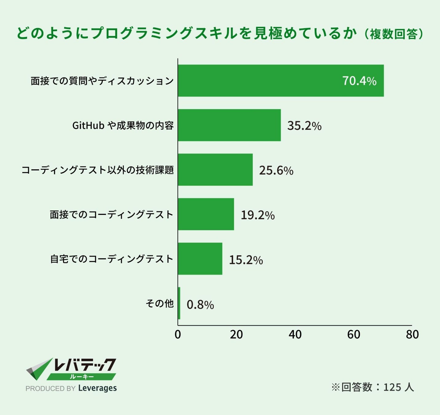 プログラミングスキルの見極め方については、「面接での質問やディスカッション(70.4%)」が最も多く、ついで「GitHubや成果物の内容(35.2%)」「コーディングテスト以外の技術課題(25.6%)」となりました。