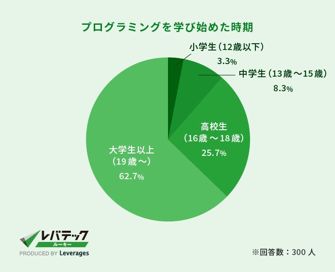 プログラミング経験がある現役大学生・大学院生のうち、学習を始めた時期として最も多かったのは「大学生以上(62.7%)」となり、ついで、「高校生(25.7%)」「中学生(8.3%)」という結果になりました。