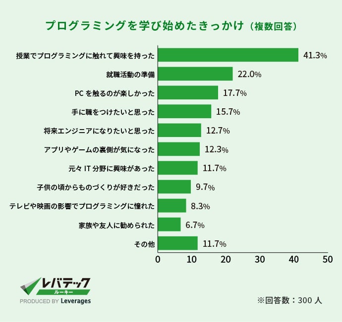 レバテック株式会社が運営する、ITエンジニア専門新卒向け就職支援エージェント、レバテックルーキー( https://rookie.levtech.jp/ )は、プログラミング学習経験のある現役大学生・大学院生300名を対象に、プログラミング教育に関する実態調査を実施しました。