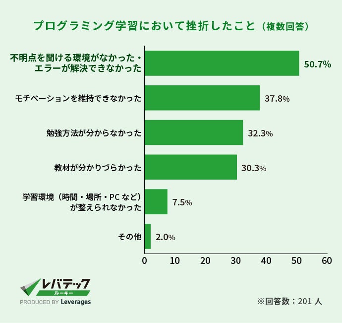プログラミング経験者のうち3人に2人の学生が、「不明点や勉強方法を聞けない」「モチベーションを維持できない」などが原因で、プログラミング学習中に挫折を経験しているようです。オンライン教材や技術ブログを通じて、誰でも気軽にプログラミングが学べる一方で、挫折原因の多くは学習環境に起因していることが予想されます。