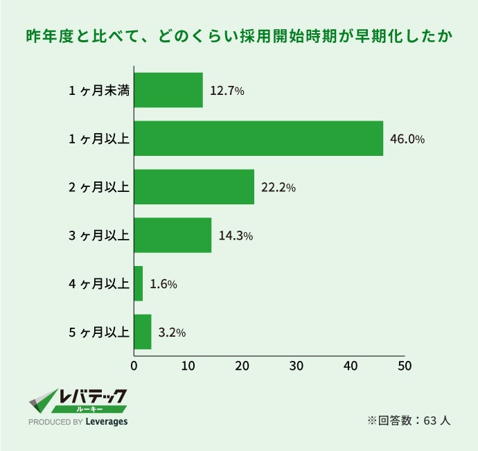 24年度卒の採用開始時期を早めた企業のうち、「1ヶ月以上」早期化したのは46.0%、「2ヶ月以上」早期化したのは22.2%という結果になりました。早期化した企業の約7割が、昨年度よりも1〜2ヶ月程度早く採用を始めていることが分かります。