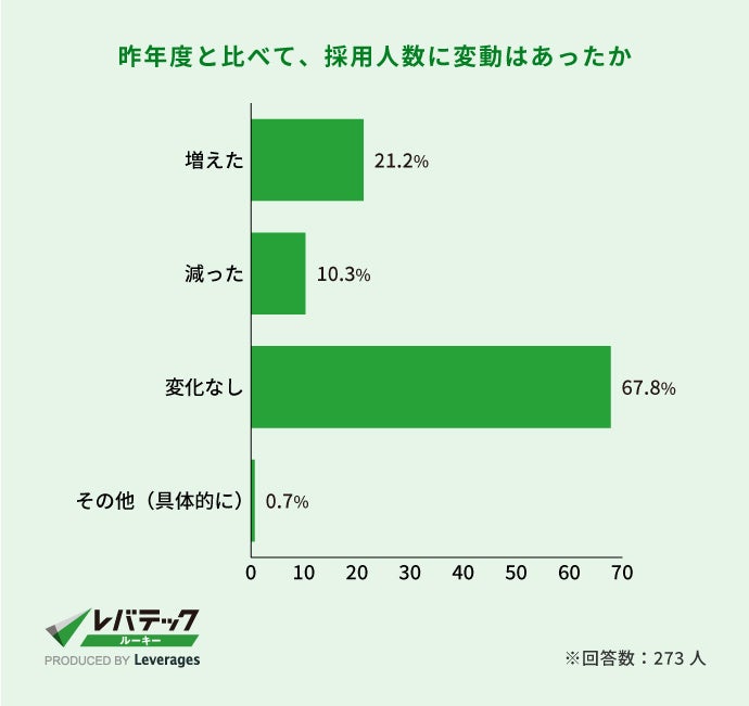 昨年度の採用と比べて、24年度卒の採用人数が変動したのは全体の31.5%でした。採用人数が増えたのは全体の21.2%となり、5社に1社は昨年度よりも新卒採用に力を入れていると推測されます。一方、採用人数が減ったのは全体の10.3%という結果になりました。