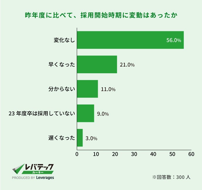 一方で、採用開始時期が23年度卒よりも遅くなったと回答したのは全体の3.0%に留まり、ほとんどの企業が昨年度と同様、または早期化していることが分かりました。