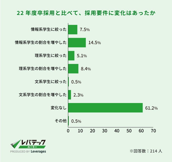22年度卒採用と比べて、全体の約4割が23年度卒の採用要件を変更したことが分かりました。回答が最も多かったのは「情報系学生の割合を増やした(14.5%)」となり、「理系学生の割合を増やした(8.4%)」と続きます。