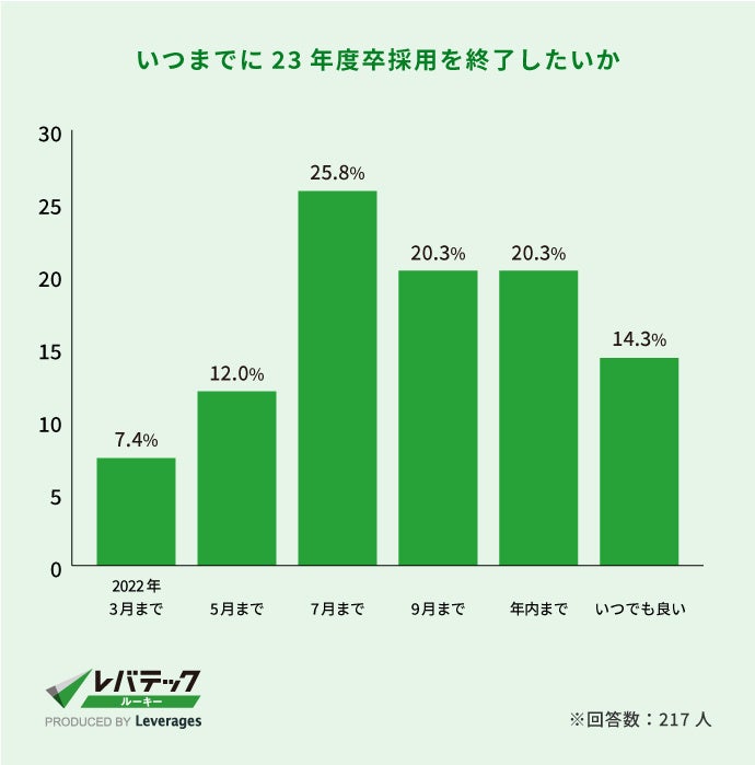 希望する採用終了時期で、最も多かったのは「2022年7月まで(25.8%)」、ついで「2022年9月まで(20.3%)」「2022年年内まで(20.3%)」が同率の結果となりました。