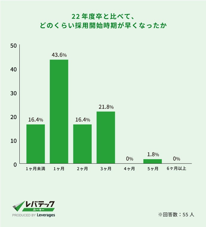 採用時期が早期化した企業のうち約40%が昨年度と比べて「1ヶ月」早期化し、ついで全体の約20%が「3ヶ月」早く選考を開始しているようです。例年、新卒エンジニア採用の早期化が指摘されていますが*1、23年度卒ではさらに早期化していることが明らかとなりました。