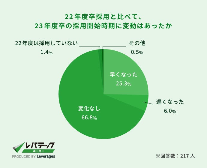 23年度卒のエンジニア採用は、本選考の開始時期が22年度卒と比べて「早くなった」と回答した企業が全体の25.3%と、4社に1社が採用時期を早めたことが分かりました。