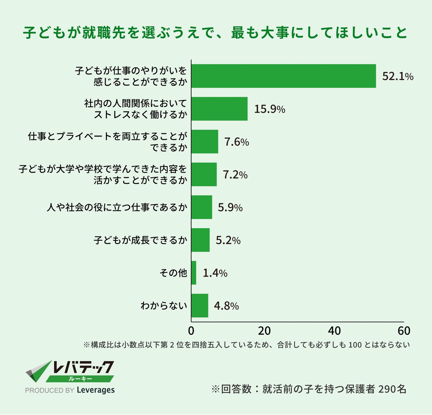 大学生・専門学生の子を持つ保護者が子どもの就職先で最も大事にしてほしいと思うことについては、半数以上が「子どもがやりがいを感じることができるか(52.1%)」と回答しました。
