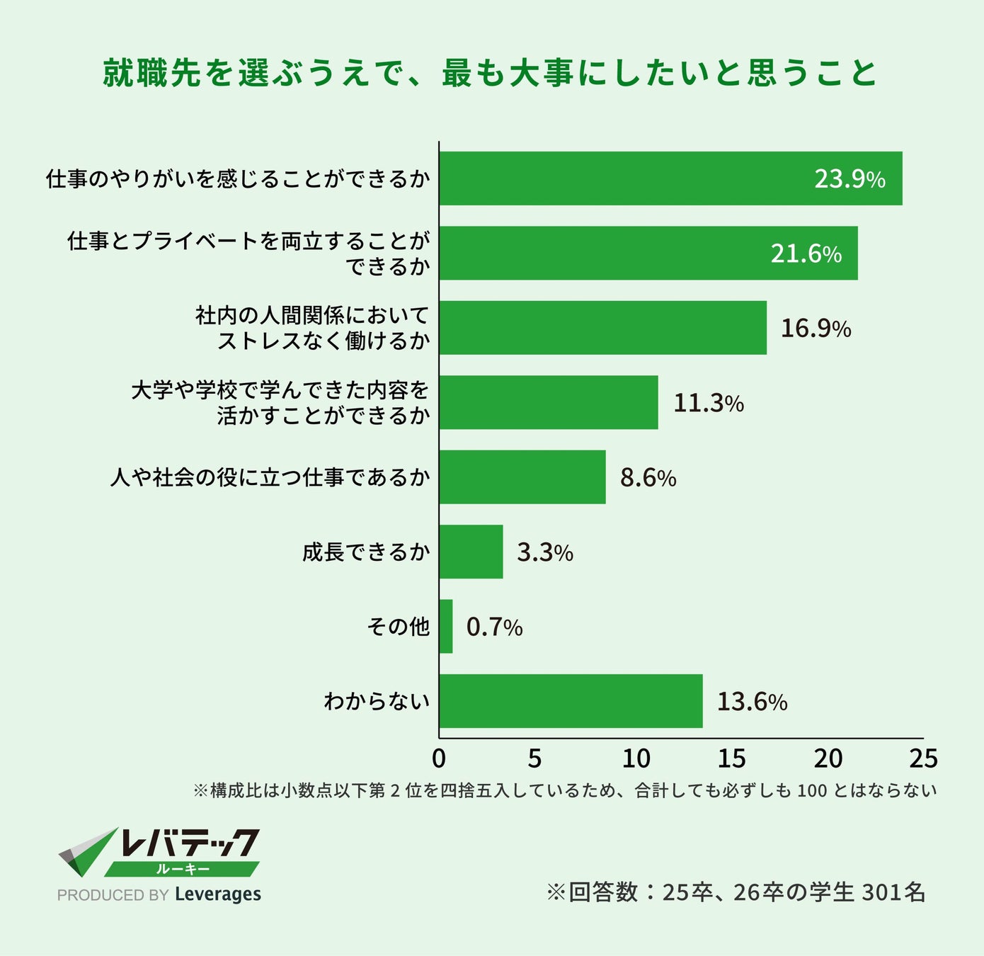 就職活動を控える学生が就職先を選ぶうえで最も大事にしたいことは「やりがいを感じることができるか(23.9%)」が最も多い結果となりました。ついで「仕事とプライベートを両立することができるか(21.6%)」が続き、仕事だけでなく、プライベートも重視していることがわかります。