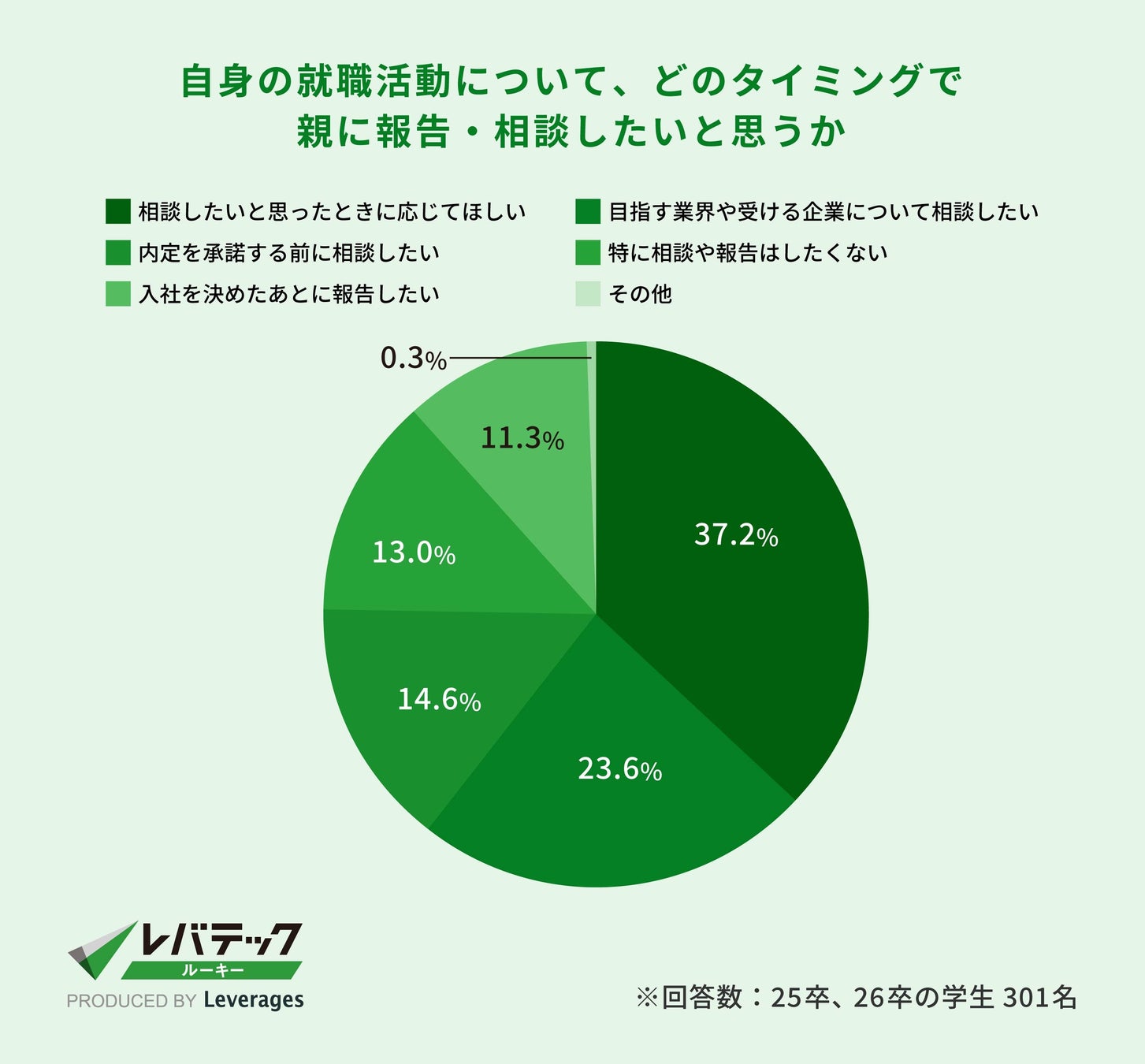 一方、就職活動を控える学生に対する「どのタイミングで保護者に報告・相談したいと思いますか」という質問では、「入社を決めたあとに報告したい」「特に相談や報告はしたくない」と回答した学生は合わせて24.3%という結果になりました。約4人に1人の学生は保護者に相談することなく、自分で入社する企業を決めることを希望しているようです。