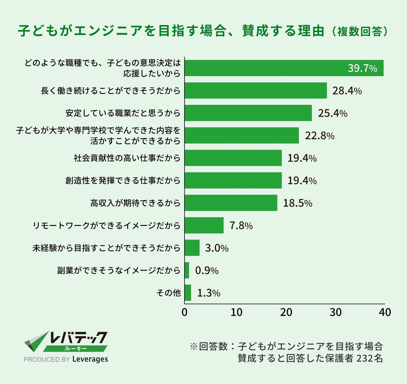「賛成である」「どちらかというと賛成である」と回答した理由は「どのような職種でも、子どもの意思決定は応援したいから(39.7%)」が最多となりました。ついで「長く働き続けることができそうだから(28.4%)」「安定している職業だと思うから(25.4%)」が続きます。